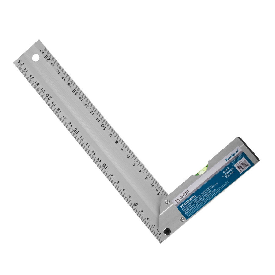 Угольник алюминиевый литой с уровнем, 1 акриловый глазок, двусторонняя разметка в см, 250мм - 15-3-025