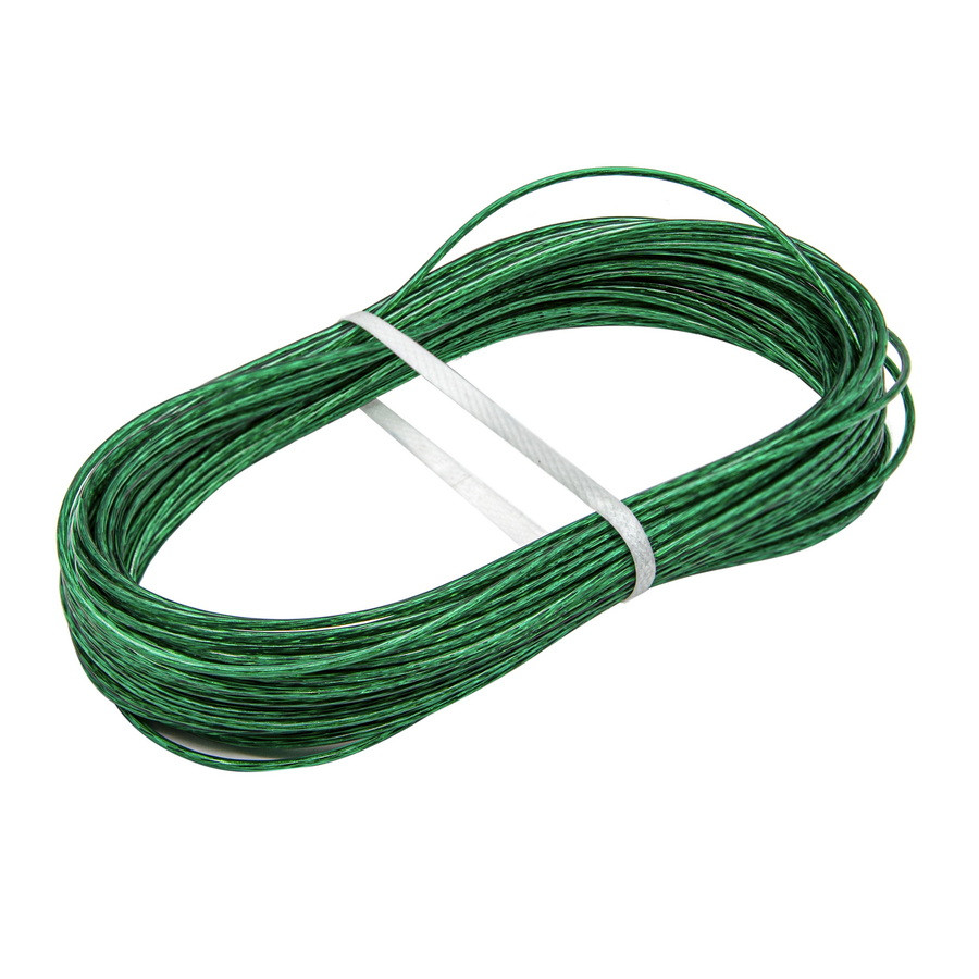 Трос металлополимерный ПР-2.0 зеленый полупрозрачный, 20 м.п. изготовлен из стальной латунированной проволоки и покрыт пластикатом ПВХ методом экструзии, что делает его более устойчивым к окислению. Применяется при погружении насосов и датчиков в скважины/колодцы, в качестве веревки для сушки белья, для подвязки растений в парниковых и тепличных комплексах, осветительных приборов, при прокладке кабельных воздушных линий (в качестве поддерживающего элемента) и проч.