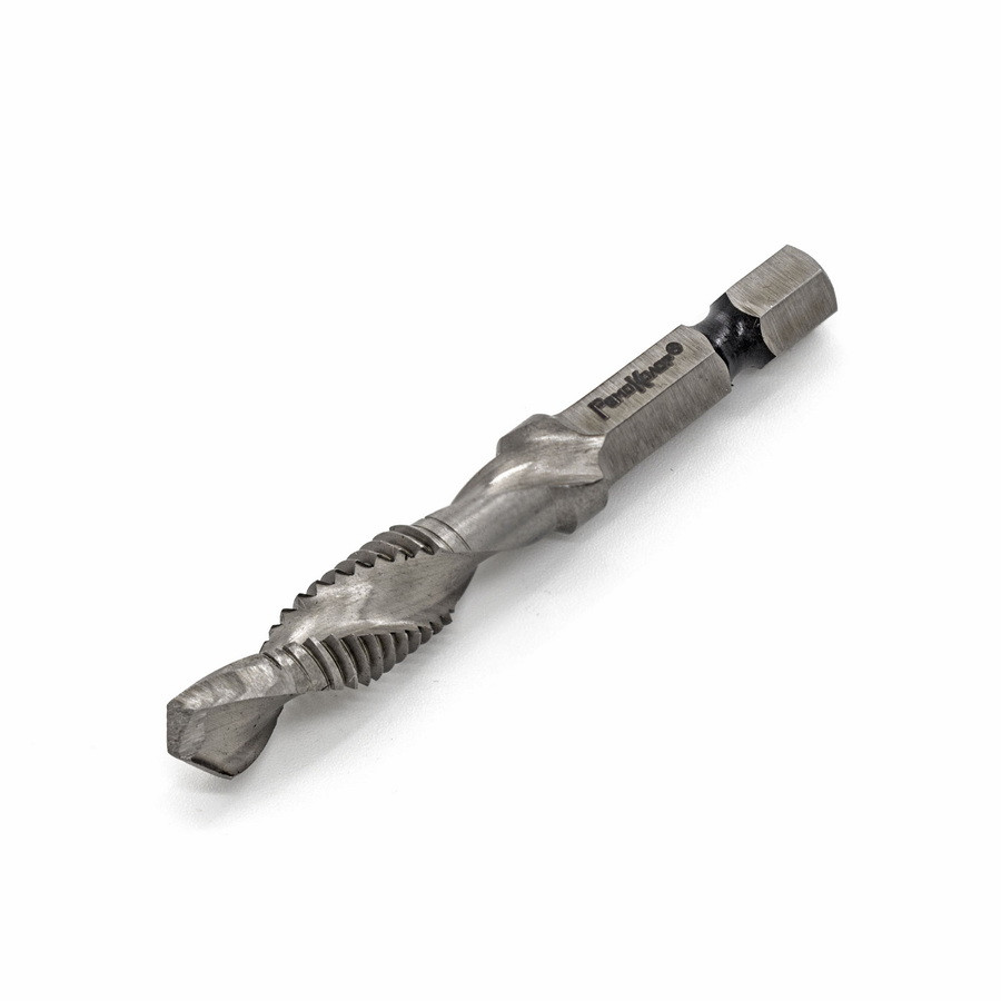 Сверло-метчик комбинированный для сквозных отверстий и нарезания резьбы. Сверление и нарезание резьбы производится за один рабочий проход, очистка резьбы - на обратном ходу. Для обработки листовых материалов и профилей из легированных и не легированных сталей с пределом прочности на растяжение до 900 Н/мм2 и цветных металлов. Изготовлено из быстрорежущей стали Р6М5, шлифованное. Шестигранный хвостовик 1/4' может использоваться со стандартными магнитными держателями для бит, это позволяет быстро менять инструмент. Хорошо фиксируется в кулачковом патроне без проскальзывания.’. Резьба метрическая DIN ISO 13, правосторонняя.