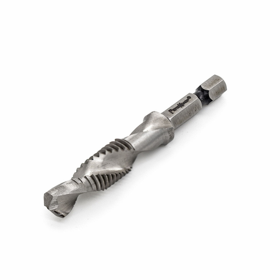 Сверло-метчик комбинированный для сквозных отверстий и нарезания резьбы. Сверление и нарезание резьбы производится за один рабочий проход, очистка резьбы - на обратном ходу. Для обработки листовых материалов и профилей из легированных и не легированных сталей с пределом прочности на растяжение до 900 Н/мм2 и цветных металлов. Изготовлено из быстрорежущей стали Р6М5, шлифованное. Шестигранный хвостовик 1/4' может использоваться со стандартными магнитными держателями для бит, это позволяет быстро менять инструмент. Хорошо фиксируется в кулачковом патроне без проскальзывания.’. Резьба метрическая DIN ISO 13, правосторонняя.